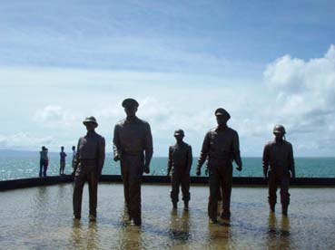 マッカーサーはじめ比亡命政権のオスメーニャ大統領らの視線は日本軍が防備していた島央のヤシの森に向いている。像の背後には海が拡がり、遠くサマール島を展望する。