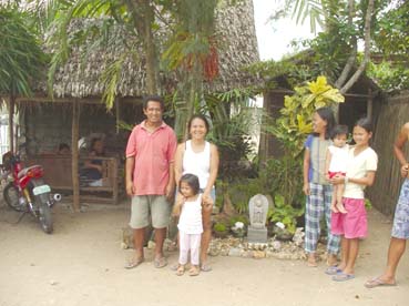 第二十六師団戦没者の慰霊碑のすぐ後ろは波打ち際である。地蔵の横にはニッパヤシで屋根をふいた吹き抜け小屋がある。テーブルとイスが置かれ、」管理人のベロソ一家十人がくつろいでいた。