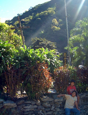 周囲を歩いていると、奇妙なものが目に入った。細めの丸太を二本組み合わせた十字架だった。碑を取り囲む植え込みから、十字架部分だけが宙に突き出ていた。昨年、地域の古老が悪霊を追い払うために立てたという。