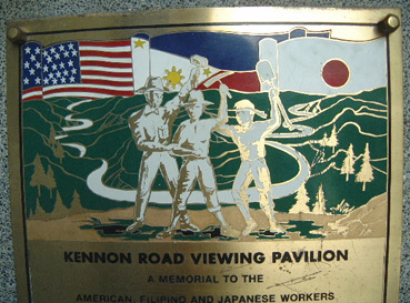 展望台を上ろうとすると、同協会の設置した記念プレートが目に入る。「ハイウエーを完成させた米比日の労働者に捧げる」という一文と三カ国の労働者の絵が刻まれている。絵は、労働者三人が道路開通を喜び合う構図。比人が中央でツルハシを掲げ、一番背の高い米国人がその腕に手を添えている。着衣はおそろいの帽子と作業着。