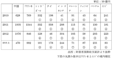この表の中国とアセアン6への投資金額を比較すると2012を除くと2010年以降アセアンへの投資額が中国への投資額を上回っていることがお分かり頂けると思います。この表には記載しておりませんが、同様の傾向は上述のように2006年から始まっております。ただし2008年は例外で中国向けが上回っていました。