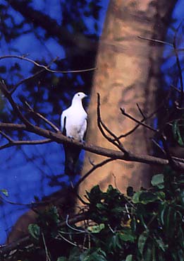 早朝、ツインロックスやディルマカド島などの切り立ったがけに生えた木々につがいや少数の群れで止まっている真っ白いハトがソデグロバト。がけの中腹の樹木上...