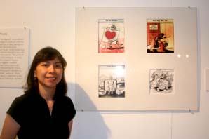 風刺漫画の展示を前に説明するヘレン・ユー=リベラUP教授