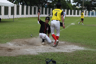 スライディングで本塁へ生還するLAラビッツの友部良倫選手=マニラ日本人学校で24日午後3時ごろ写す