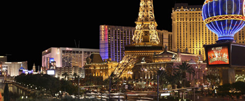 米ネバダ州ラスベガスの目抜き通りに並ぶ不夜城のカジノ。専用バスによる夜景見学ツアー(12ドル)も人気