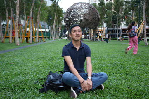 撮影を振り返る大西健之さん=首都圏タギッグ市のフォートボニファシオで写す