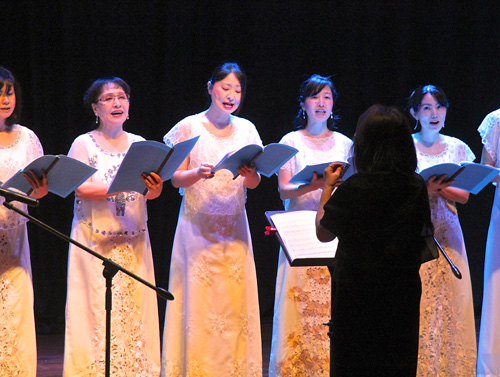 中島みゆきの「糸」を披露するラ・メール合唱団=3日午後4時すぎ、首都圏マカティ市の瓜生劇場で冨田すみれ子撮影