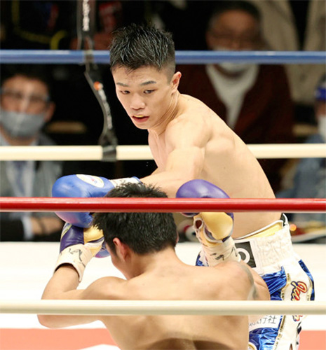 WBOフライ級王座決定戦の8回、マグラモ(手前)を攻めダウンを奪う中谷潤人=6日、東京・後楽園ホール(代表撮影)
