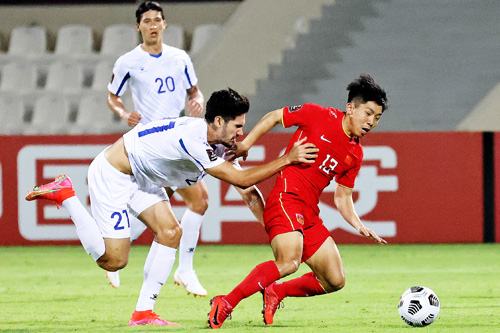 ボールをキープする中国の選手に追いすがるフィリピン代表のマーク・ハートマニン選手(左)=7日、アラブ首長国連邦(AFP=時事)