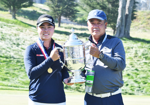 ゴルフの全米女子オープンを制し、トロフィーを手にする笹生優花(左)と父の正和さん=6日、米サンフランシスコのオリンピック・クラブ(時事)