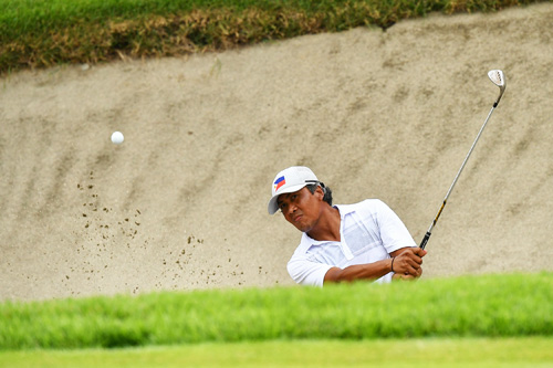 ゴルフ男子第2ラウンド18番ホールでバンカーからのショットを放つパグンサン=30日、埼玉県川越市の霞ヶ関カンツリー倶楽部(AFP=時事)