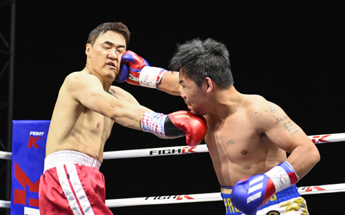 DK・ユーに強烈な右フックを当てるパッキャオ(右)=11日(AFP=時事)