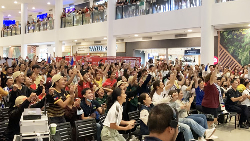 初勝利の瞬間歓声を上げる来場者=首都圏ケソン市で25日、沼田康平撮影