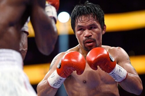 世界ボクシング協会ウエルター級タイトルマッチに臨むマニー・パッキャオ氏。パリ五輪を目指す意向が明らかになった=2021年8月、米ネバダ州ラスベガス(AFP時事)