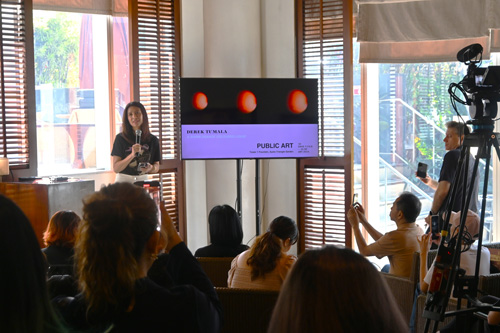 メディア発表で参加アーティストを紹介する共同創立者のトリッキー・ロパさん=16日、マカティ市ラッフルズホテルで深田莉映撮影