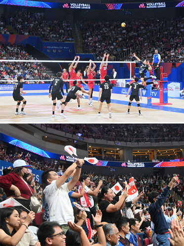 (上)ジャンプしてスパイクを打つ態勢に入る宮浦健人選手。(下)日本が勝利し歓声を上げる比人観客ら=MOAアリーナで23日、深田莉映撮影