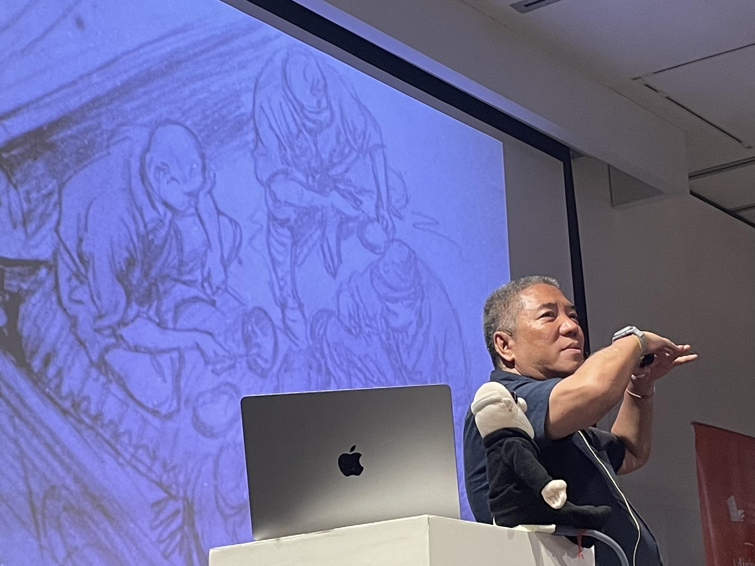 アモルソロによる日本軍兵士のスケッチを紹介するオカンポ氏=16日、首都圏マカティ市アヤラ博物館で宇井日菜撮影