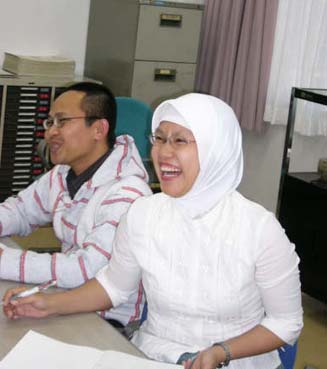 ジルバッブ姿で日本語研修中のチャエサリア・フィトゥリアニさん(右)=海外技術者研修センター