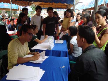 4日に行われた就職フェアで企業側担当者の説明を聞く求職者たち=首都圏カロオカン市