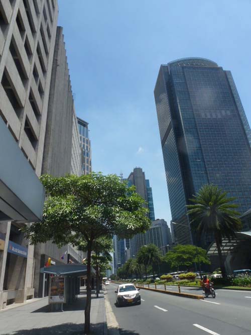 フィリピン屈指のビジネス街、首都圏マカティ市アヤラ通りのビル群=12日午前11時半ごろ写す