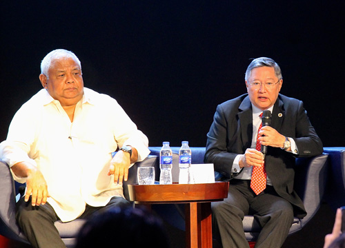 インフラ整備計画について説明するドミンゲス財務長官=18日午後2時ごろ、首都圏パサイ市のホテルで冨田すみれ子撮影