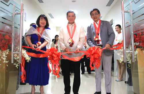 テープカットを行う(左から)グレゴリョ・センター長、古田英範執行役員常務、イバラヒム情報通信技術次官=11日午後3時半ごろ、ビサヤ地方セブ市で森永亨撮影