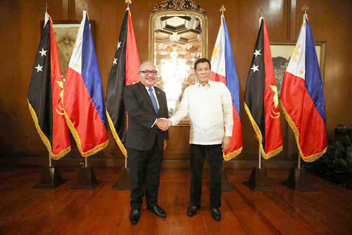 パプアニューギニアのオニール首相(左)と握手を交わすドゥテルテ大統領(右)=大統領府提供