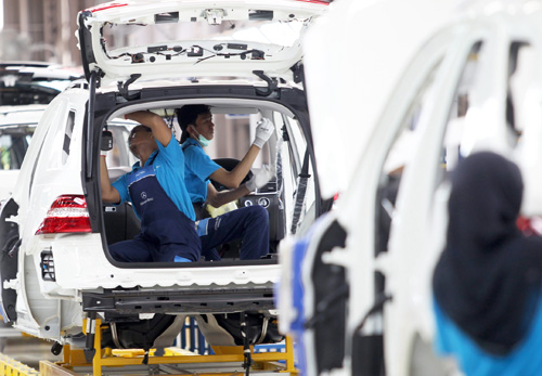 ドイツ高級車メーカーの乗用車を組み立てるインドネシア人労働者=メルセデス・ベンツ・インドネシア工場(EPA=時事)