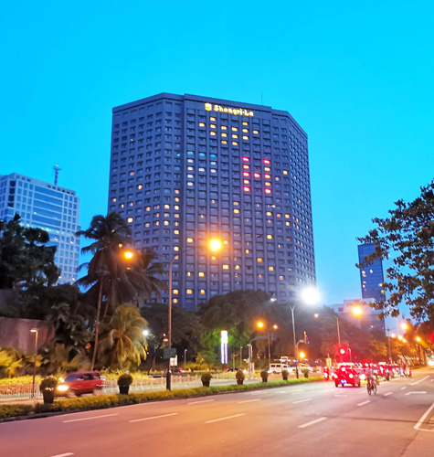 マカティ・シャングリ・ラ・ホテル。窓明かりで?PHと描かれている=5月21日午後6時半、毛利三千代撮影