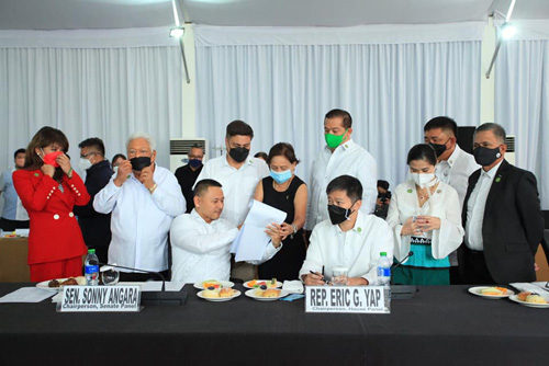 両院協議会が2022年予算案で合意。報告書に署名する上院財務委員会のアンガラ委員長(着席左)と下院予算委員会のヤップ委員長(同右)=15日、アンガラ上院議員提供