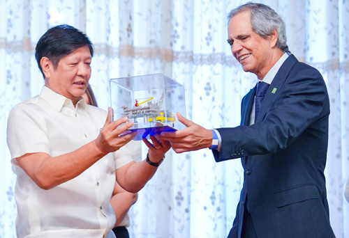 マランパヤ天然ガス田事業主体を率いるエンリケ・ラソン氏(右)から海上プラットフォームの模型を受け取るマルコス大統領=大統領のフェイスブックより