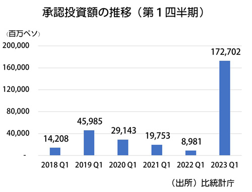 比統計庁は16日、今年第1四半期(1~3月)の海外からの合計直接投資承認額が1727億200万ペソだったと発表した。89億8100万ペソだった前年同...