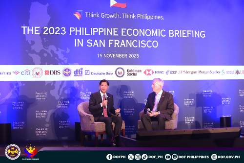フィリピン経済ブリーフィングで比経済について語るマルコス大統領(左)=大統領広報室フェイスブックより
