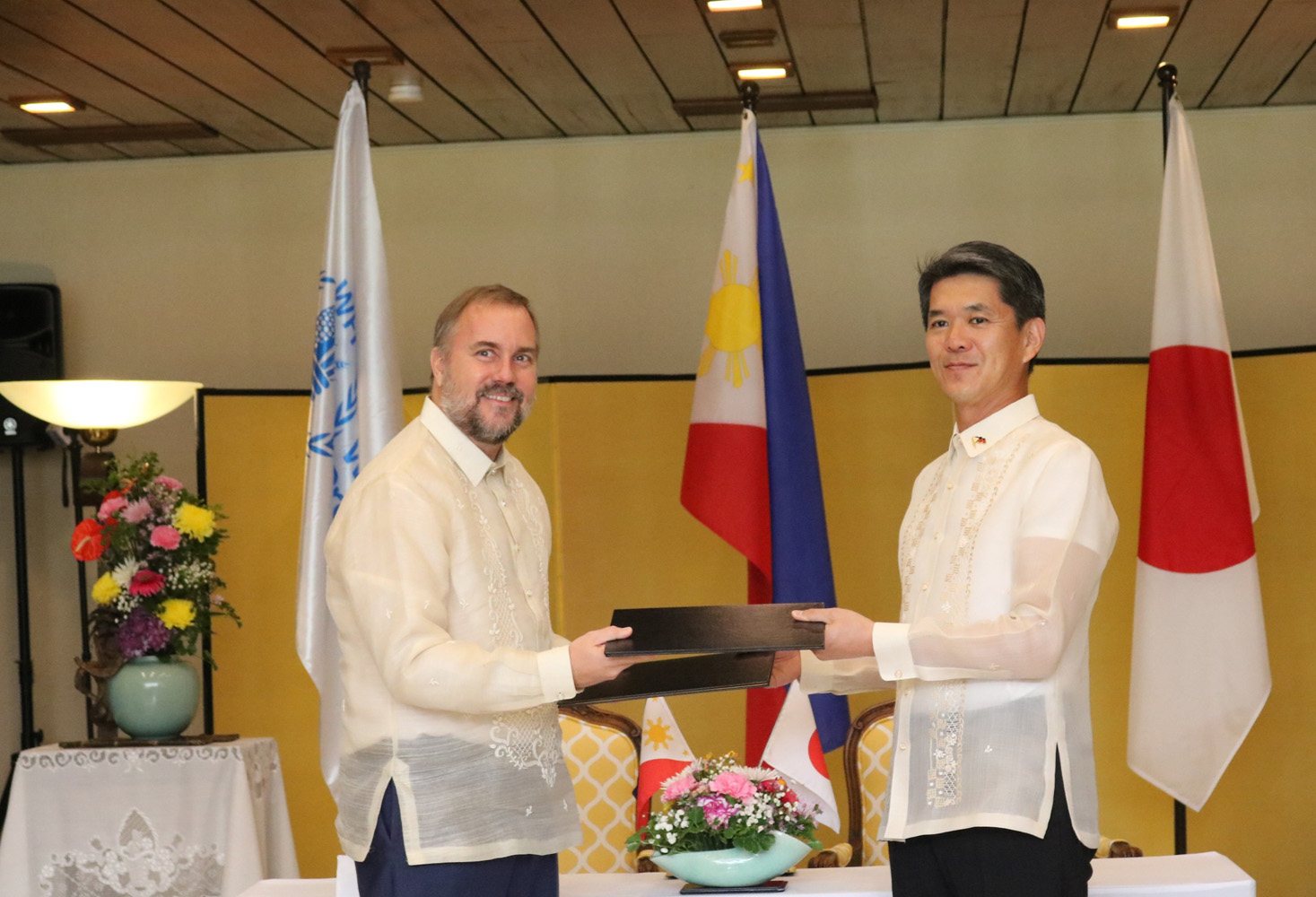 公式文書を交換する遠藤大使(右)とWFPのチャップマン・カントリーディレクター=28日、首都圏マカティ市日本大使公邸でイザベル・ホワイト撮影