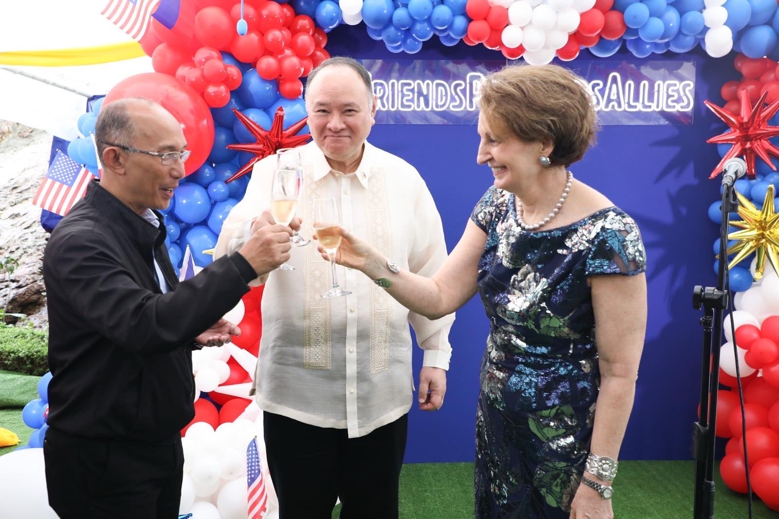 BAGUIO-- Defense Secretary Gilbert Teodoro Jr exchange toasts with United States Ambassador to the Philippines Mary Kay Carlson (right) and Baguio City Mayor Benjamin Magalong in Wednesday's 80th Anniversary of Victory Day at the US Ambassador's Residence at Camp John Hay. Department of National Defense