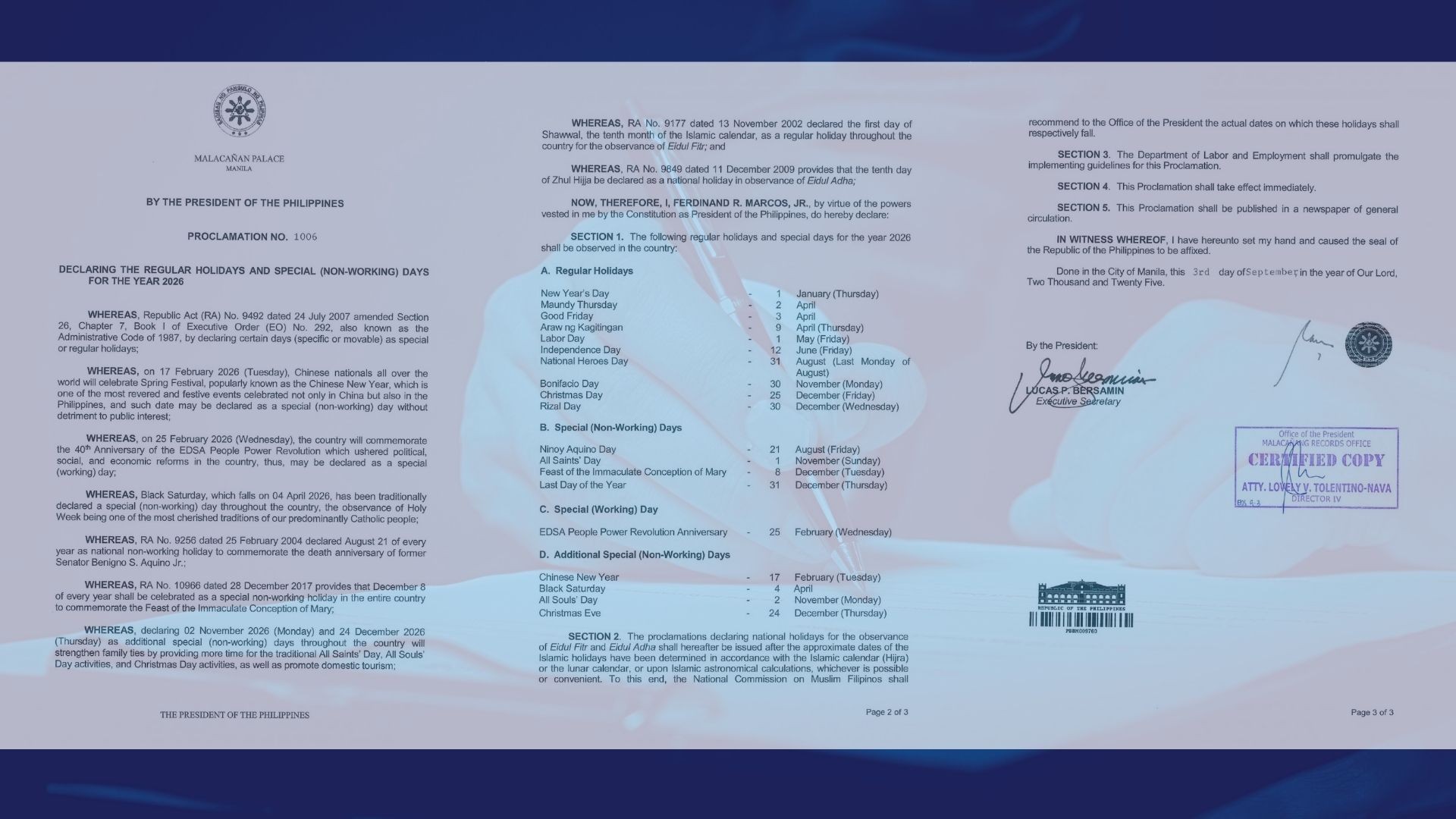 President Ferdinand Marcos Jr. issued Proclamation No. 1006 declaring the regular holidays and special (non-working) days for the year 2025.