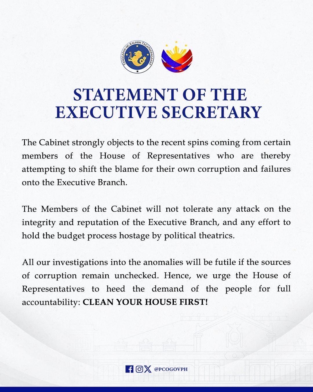 In a statement, Executive Secretary Lucas Bersamin took strong exception to attempts by certain members of the House of Representatives to shift the blame for the revealed corruption in public infrastructure projects to the Executive Branch.