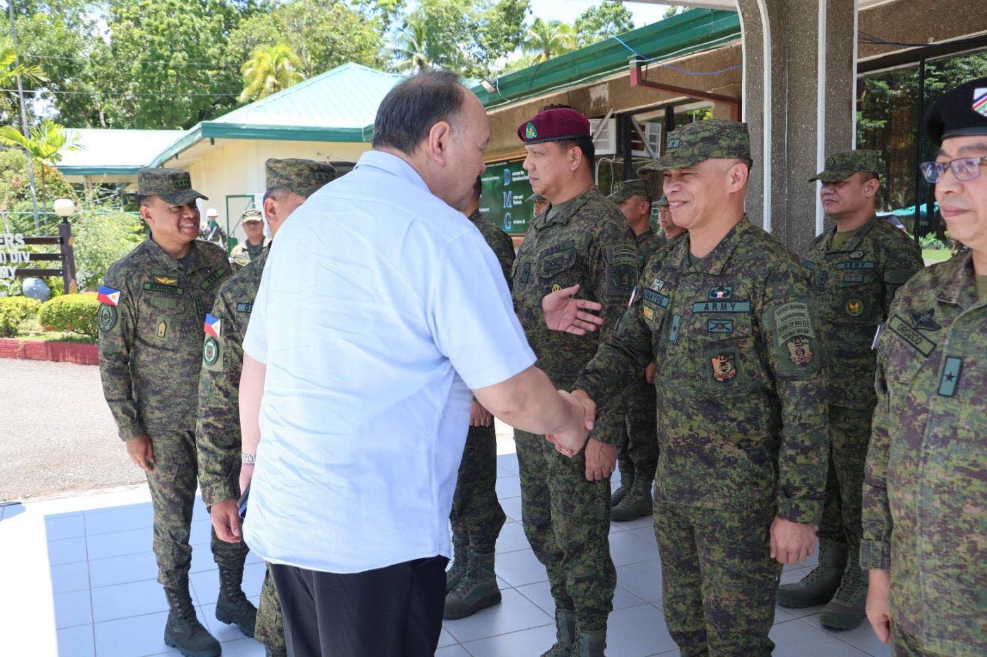 Defense Secretary Gilbert Teodoro Jr and Armed Forces of the Philippines (AFP) chef Gen. Romeo Brawner Jr meet military personnel tasked with securing the Bangsamoro Parliamentary Elections. To Teodoro's right is Maj. Gen. Donald Gumiran, 6th Infantry Division Commander. (6ID Public Affairs Office)