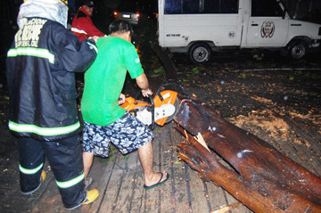 強風で倒れた木を処理する消防局員ら=30日午前1時半ごろ、首都圏マカティ市アンティポロ通りで写す