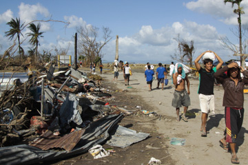 レジー・タブーフさん(35)は「商店は台風で壊されてしまったから現金は使い道がない。何よりも食料と水が欲しい」と、被災地の厳しい環境を訴えた。ジュン・ランドランサさん(38)は「おれもビールが飲みたい」とつぶやきながら、どこからか手に入れた酒を飲む近所の住民をうらやましげに眺めていた。