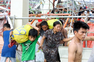 ビサヤ地方レイテ州タクロバン市では、猛烈な台風ヨランダ(30号)直撃から3日間が経過した11日も、救援物資を求める住民が朝早くから空港のゲート前に長蛇の列を作った。中には夜明け前から待つ人も。空港から約6キロの全壊した大型商業施設へ行ってみると、倒壊した壁の下に隠れた食料を盗み出す被災者でごった返していた。