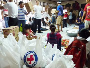 台風ヨランダ(30号)による甚大な被害を受け、フィリピン赤十字社は義援金や救援物資の支援を呼び掛けている。台風のビサヤ地方横断から3日が過ぎた11日、首都圏マニラ市の本部では、飛び入りで参加した外国人観光客を含む多数のボランティアが食料を袋分けしている姿が見られた。