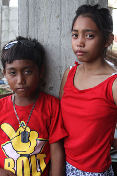 母の遺体は見つかったが、妹トリクシーちゃん(3)は行方不明のままだ。ダンテ君と姉デイジーミーさん(13)は、近所の仲間と一緒にがれきの街で、妹の遺体を探し回った。赤い半袖シャツに半パンツ姿のダンテ君は、右足に黄色のビーチサンダルを片方だけ履き、左足ははだし。左足裏の擦り傷から血がにじみ出ている。