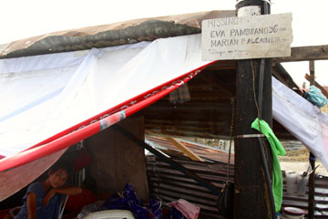 5 被災者の掘っ立て小屋前には行方不明の親族の名前と「助けてください」とのメッセージ=11日午後4時ごろ、空港付近で写す