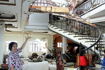 シンコさんの自宅は、タクロバン空港に近い高級住宅地「ベータ・ベイビュー・ホーム」にある豪邸。広い庭と私道を加えた敷地面積は約5ヘクタールにもなる。邸宅内には、幅約2メートルの木造らせん状の階段がある。11日午後、記者が訪れると、吹き抜けのリビングには汚れたままの高級洋酒や絵画が散乱していた。
