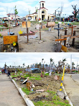 台風ヨランダ(30号)で、ともに1千人を超える死者を出したビサヤ地方レイテ州のパロ、タナワン両町。被災から3週間が経過した今も、遺体が新たに見つかり、集団埋葬地となった教会や役場前の広場、がれきの残る道路脇に葬られ続けている。