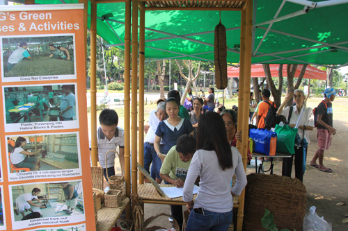 マニラ司教区主催の環境イベントのブースに集まる参加者=22日正午ごろ、首都圏マニラ市リサール公園で加藤昌平撮影