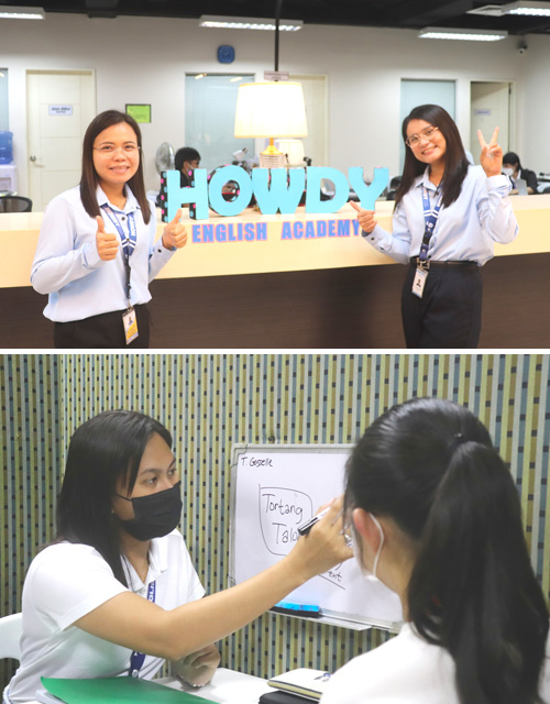 (上)英語学校「Howdy」(ハウディ)で働く職員のジーアン・マノリニャさん(左側)とラブメイ・カティンさん=5日午前、セブ島マンダウエ市で岡田薫撮影。(下)日本から来た高校生に対面式授業を行うハウディの英語講師(左)=5日午前、セブ島マンダウエ市で岡田薫撮影