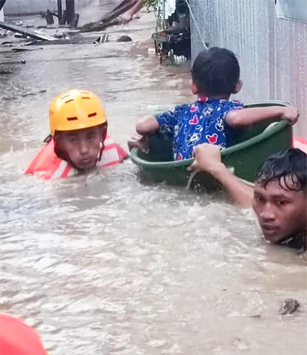 子どもを救助する沿岸警備隊員ら=11日、ミンダナオ地方サンボアンガ市(沿岸警備隊提供)