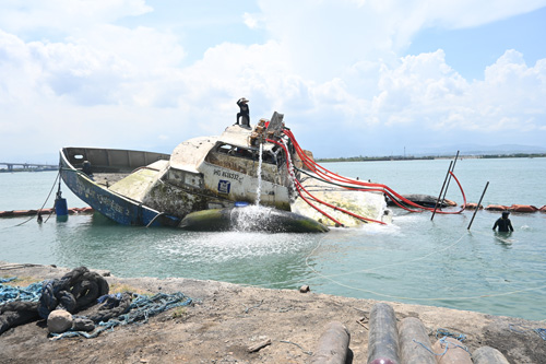2021年末にビサヤ地方とミンダナオ地方北部を襲った大型台風22号(比名オデット)の被害を受け沈没した船を引き上げる作業が続いている。作業には約3カ...